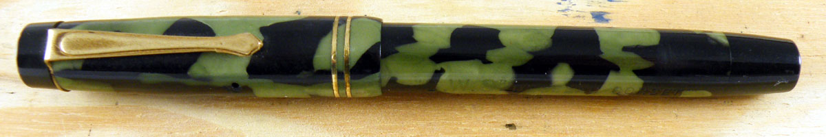 And in it were two glorious pens, a mottled hard rubber lever filler from the twenties, which looks like it has never been used, and a later, maybe forties, button filler in striking green/black marbled celluloid. Score? Well, maybe…