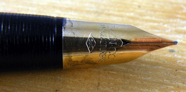 The Penco name was adopted by the Rossi Brothers in 1952 after a couple of decades as FRV. It was a period in which English or English sounding names went down well in Europe. This pen was their much-advertised No 53. The resemblance to a Triumph-nibbed Sheaffer is obvious and clearly no accident. It’s a copy but it’s also something more; the Rossi brothers admired the Sheaffer Balance and had the confidence to believe that they could produce something even better. The 53 is the result. The filling system with which this pen was fitted when first issued was quite complicated and bore some resemblance to Parker’s Vacumatic. Between 1953 and 1954 the first version was replaced by the 35B which had a version of the Touchdown filler. That’s the pen I have here. All in all, this was beginning to look very like an infringement of Sheaffer’s patents and legal action was threatened. In response, the pen was fitted with a piston filling system, but this was not enough for Sheaffer and in the face of expensive legal proceedings the Rossi Brothers withdrew the pen and, indeed, the company didn’t survive much longer.