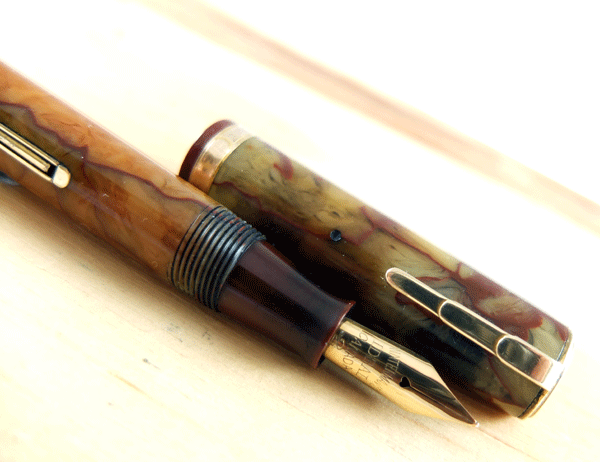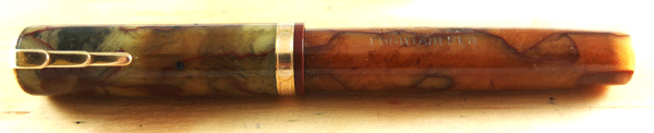 This is the Lady Patricia, issued around 1930 as the distaff addition to the Patrician, which it resembles in the materials used but in no other way, really, except for the lever box. It’s a simple and elegant design in its own right, shown off by some of the best celluloid Waterman ever employed.