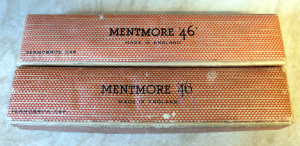 Here’s a fine pair of Mentmore 46 pens, probably made a few years apart as there are notable differences between them. 46s came in three versions, gold-filled, sterling silver and what Mentmore calls Permobrite, which seems to be rhodium plating over I know not what – probably a nickel layer and brass, I should think. These two are Permobrite ones and they look pretty good.