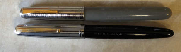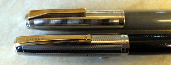 I think the plating may be suffering a little loss on the grey one but the black one still looks perfect. The differences I spoke of are evident here. The barrel end is more blunt on the grey pen and the clip is a different shape. The black one is slightly longer, too, but that may not be a design change. Many older pens weren’t made quite identical, particularly where length is concerned.
