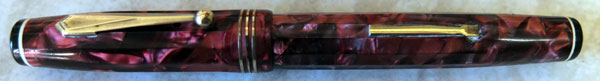 Back to the nineteen-thirties today, to that dodecagonal pen I hinted at, the Parker Parkette DeLuxe. This is yet another of Parker’s Thrift-Time pens but for a money-saver it’s pretty well appointed. The fluting is a pleasure to look at and it feels good in the hand. I’m surprised more pens didn’t adopt this design. The black button with a white line under it on the cap top and the barrel end is an eye-catching feature, and the gold-filled lever, clip and triple cap rings was laid on thick enough to have withstood the passage of the years. In all, this is quite an outstanding pen.