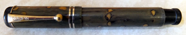 Here it is in the ever-popular “Pustule and Vomit” pattern. My guess is that this, too, is a thirties pen. If you study it for a moment or two you begin to see that it looks a bit like a child’s drawing of a Duofold. At a stretch, this pen could be repaired. The section fitting is best described as “rammed in” and it might need to be glued in place. The pressure bar has disappeared so one would need to be cut to fit. The peg that the sac fits on is very slender, so it would need a necked sac. The plated nib, impressively enough, has tipping material and the blind cap and brass button are fine.