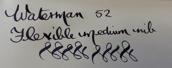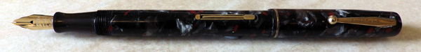 This red and grey marbled celluloid was popular and was used in several other Waterman models of the time.  Despite its face-lift and new material, the 52 began to look dated when compared with pens designed in the thirties.  As demand for it dropped, the pen disappeared from the Waterman catalogues.  Celluloid 52s are far less common than the hard rubber ones.  The 52 appeared in so many different forms that it makes an ideal subject for collecting and it is, of course, the writer’s pen par excellence.