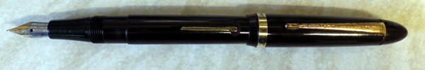 This is a Bury, an English-made pen I’ve never heard of before and about which I can discover precisely nothing.  Was it made in Bury St. Edmunds?  Is the pen so bad that it should be buried?  Actually, no.  It’s clearly a cheap pen.  Going on the plastic feed and section, I’d guess at the early fifties.  Whatever gold-alike substance was once on the trim has suffered quite a bit of wear.
