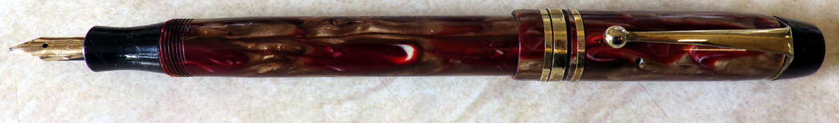 Looking at this 1930s example, I strongly suspect that they were made by Mentmore.  The whole impression of the pen reminds me strongly of  Platignum at this time, especially the beautifully boxed colourful pen and pencil sets.  Richly-coloured plastic unlike anything anyone else was using at the time, cap bands that are none too secure, tiny 14ct gold nib and button filling system – all are very like the Platignum output of the time.  Was Golden Guinea one of Mentmore’s many sub-brands, or were these pens made for another company?  For the moment we can’t tell, but I have no doubt all will come out one of these days.