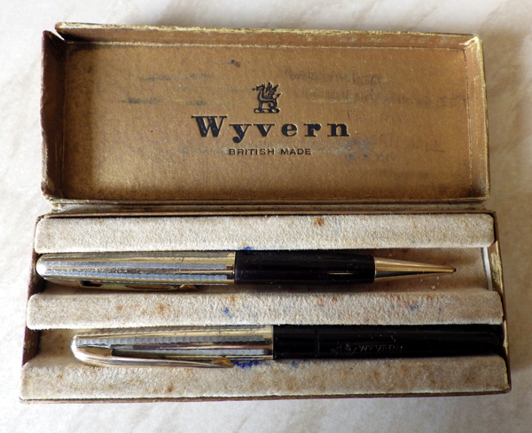 I puzzled a little over the date of this Dinkie-sized Wyvern Princess set until I removed the tray from the box and found all the paperwork inside – instructions, guarantee and the original sales receipt, dated September 1951. With their engraved caps, nestled in their plush box, this set would have made a very acceptable gift. They don’t look like the output of a company within five years of dissolution, but thankfully for all concerned, nobody in the fountain pen industry saw quite how bad the future was going to be.