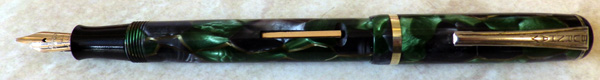 This Burnham No 51 is an example of the latter. The seller’s photographs were good and it appeared to be free of the pernicious crazing. The green and grey with amber veins made a wonderful pattern. To cut a short story even shorter I bought it and I was not disappointed when it arrived. Though it’s quite a small pen (11.8cm capped) it’s a good quality one. The cheaper versions have screw-in nibs but this one has a proper 14ct gold nib and ladder feed, held by a robust section. Unlike later Burnhams this example has a low, rounded clip screw which gives the cap a pleasing design. Burnham’s Achilles’ Heel is poor gold plating and this pen is no exception. The gold wash clings to the lever and cap ring but is largely gone from the clip. It doesn’t spoil it, really, because the base metal of the clip cleans up to an impressive shine.