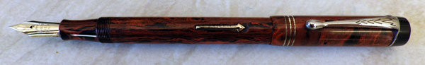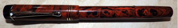 This, for future reference, is a Wyvern 60N.  It closely resembles some other models of that mid-twenties period.  I’ve seen an unnamed button filler in this rich mottled hard rubber, differing in the filling system and the addition of medium bands at the top and lip of the cap.  Another has an inserted clip and no black clip screw.