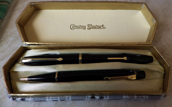 I don’t often get Conway Stewart sets. They tend to be priced a bit beyond my restricted budget, but I managed to snag this nice black CS12/Nippy No 3 set the other day. The box is nice and fresh too. The pencil, strangely, shows wear to the gold plating whereas the pen doesn’t. It’s usually the other way round. I’m very pleased with it, though. It ,looks great for a set that was made at least fifty years ago. I love the pattern on the box. Conway Stewart knew how to present a pen and pencil set back then.