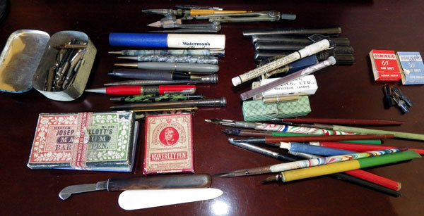 Stuff is made up of those item that have little value but some usefulness.  None of it is any good to me but who knows?  Someone out there might have a use for it.  One man’s junk is another man’s treasure, or so they say.  (I’m not so sure about that.  Treasure is gold, jewellery and bags of doubloons.  It’s not a pile of mechanical pencils, dip pens and Osmiroid screw-in nibs).  Anyway, what have we got?  There’s a variety of mechanical pencils.  Most seem to work quite well, but don’t challenge me too hard on that.  Mechanical pencils are not my area of expertise.  There are leads in great profusion, in a variety of sizes and colours.  There are masses of dip nibs, some of which look strange and unusual and are a bit beyond my ken.  To go with that there are lots of dip pen handles, some chewed, others not.  There are some scientific instruments that appear to be of rather better than average quality.  Joseph Gillott’s Magnum Barrel Pen makes a couple of appearances and there are a few Swan Pockets.  There’s even a phleems, should you feel the need to bleed yourself – or, indeed, anyone else, though I would advise getting their permission first, to avoid any unfortunate misunderstandings.