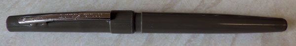 The pen closely resembles the Flowline nylon-tipped pen which was introduced in 1972, and doubtless this one is of the same date.  Essentially, the pen expands with slightly curved lines from both ends until they meet in the complexity of the lower cap and the barrel.  Very seventies, one might say, afflicted with the same style that was applied to everything from cars to transistor radios.  Still, it’s functional, isn’t it?  Well, no.  The raised, ridged area at the bottom of the cap looks as if it would be useful in unscrewing the cap – except that the cap doesn’t unscrew but is friction fit.  Unscrewing merely removes the barrel and leaves the nib/section unit inside the cap.