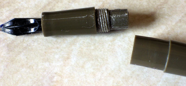 Goodness knows what compelled the “designers” to use that military drab colour.  Full-on khaki would be attractive by comparison.  At a stretch it could be described as olive green by the kind-hearted but at least the ugliness of the colour is consistent with the rest of the pen.  The cap pulls off to expose an imported steel Smoothline nib, about which one might say that it’s no worse than many other cheap after-market nibs.