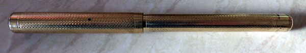 In the early days of Mabie Todd production in Britain, gold nibs and overlay pens whether plated or solid gold were still made in America.  British and American models were the same at that period, and this pen appears to have been overlaid on a Safety Screw Cap base.  They’re not particularly common in overlay form.