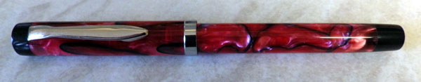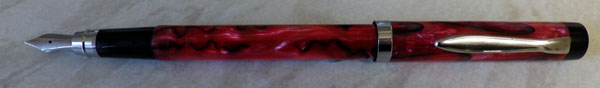 The only Indian pens I’ve had have been two Walitys, a medium-sized piston-filler (good) and a large eyedropper filler (dreadful), so I thought I might try something else from there as the pens are so inexpensive. After looking through the plethora of pens available I settled on Fountain Pen Revolution and and chose their Triveni Acrylic. According to the blurb: “The Triveni Sangam is a confluence of 3 rivers in India. The handmade Triveni accepts 3 fill methods (converter, eyedropper, cartridge).” That makes sense. The pen cost me the princely sum of $45 (around £28 – £29). It arrived this morning. First impressions: it’s very long at 14.7cm. The red and black acrylic is translucent and very beautiful. The black tassie and blind cap set it off very well. (These serve no purpose other than the aesthetic) The fine nib is a nail. The pen takes two and a half turns to close, which feels like a lot. The chrome-plated metalwork is good.