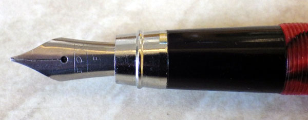 Another thing about this part of the pen: though this is a normal-sized nib, similar to a Swan No 2 in size, the excessive length of the barrel makes it appear very small and out of proportion with the rest of the pen. If the pen is to be so very large, a bigger nib would look better. The feed appears to work well but I haven’t used the pen enough to be sure.