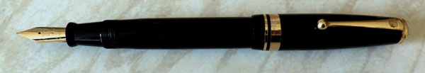 This is a big pen, 14cms long capped, with considerable girth.  It’s a button filler.  The blind cap blends into the barrel seamlessly.  It’s a tapered pen, sharing a shape with the English Duofolds or larger Conway Stewarts of the time.  The cowled, ball-ended clip is stamped with their “coat of arms” logo, as is the huge semi-flexible gold nib.  Unusually, maybe even uniquely, the cap band configuration is a broad and a narrow ring.