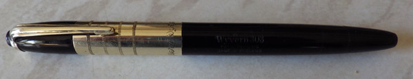 As is usually the case with Wyverns, there isn’t much information available for the 303. It was introduced in 1948 along with several other hooded or semi-hooded new models. In truth, the 303 can’t really be regarded as even semi-hooded. It’s a perfectly traditional button-filler. It just doesn’t look it. The very small nib is fully visible. Small though it is, there’s still room for the little Wyvern image. The extremely long cap band (if you can even call it that) has no equal anywhere, though perhaps the Waterman Taperite Citation comes close.
