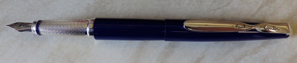 So how does it perform? Pretty well, actually. The beautifully engraved section provides quite a decent grip. I’m not fond of metal sections but the depth of the engraving reduces the cold and slippery feel of the metal. It’s well-balanced and would be quite comfortable in the hand were it not for the weight. It’s a full 34 g which is a bit heavy for my taste. Unless you had bionic assistance, you would find this tiring after a page or so. It’s resin over brass, the usual method for giving a spurious sense of quality through excessive weight. That aside, it’s a pretty good pen to use in short bursts. The stainless steel nib is medium, firm and very smooth indeed.
