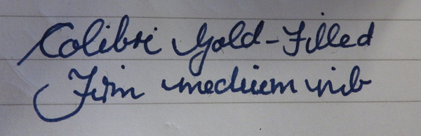 It will post but unless you keep it upright the cap will fall off. Allowing for that, it’s a very pleasant pen to use. It isn’t heavy for a metal pen and the black plastic section provides an adequate grip. The nib which bears the Colibri name is plated and is a very smooth firm medium.