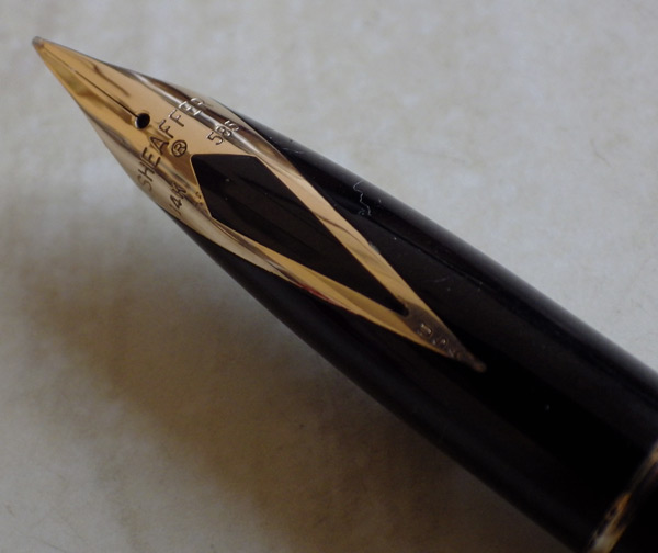 I have found Targas to be eminently practical pens, well-balanced, robust and always ready to write. They are more than that, though. Walter Sheaffer was a jeweller and until recent times Sheaffer pens have always reflected that. Though it is by no means delicate and easily damaged, the pattern on this pen does make it a form of jewellery – though a useful form. The famous Sheaffer inlaid nib, often firm but never a nail, is also a thing of beauty in its own right.