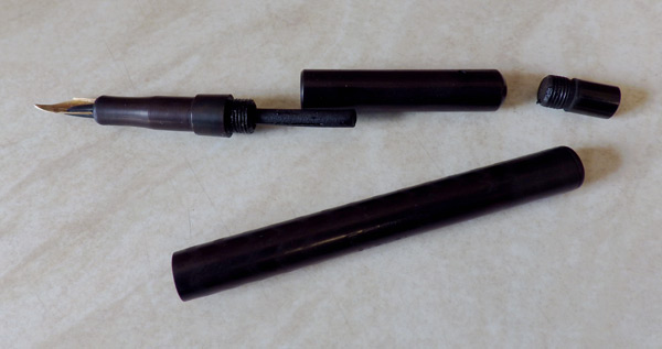 This rather ordinary-looking eyedropper filler has a bit more to it than meets the eye – at least at first glance.  It seems that you have the choice of filling it in the usual way, by unscrewing the section, or, in this case, by removing a screw-in plug at the end of the barrel and filling from there.  I’m not sure what the benefit is in that or even if there’s a benefit at all.  It may be just another place that has the potential to leak ink.  That aside, it’s quite a conventional eyedropper pen, slender, with an over and under feed and engine chasing on the barrel but not on the tight fitting cap.
