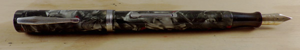 Here’s a beautiful Waterman 94 in the pattern known as grey pearl. It’s a stunning pattern raised from the obscurity of just another grey marble by the splashes of red throughout. The 94 is a good size of pen at 12.6 cm, and it’s quite thick. It makes for a very comfortable pen to write with.