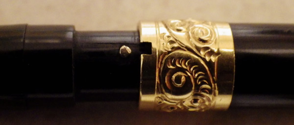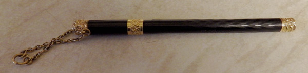 Apart from being very pretty with its rolled gold trim and machine-chasing, this pen is significant also for the secure, bayonet-style closure which, so far as I know, was never picked up by anyone else. Unfortunately C. Haines is just too common a name for me even to speculate about the identity of the pen’s first owner. Suffice it to say that she was a very fortunate lady, doubtless from a wealthy background – a true chatelaine!