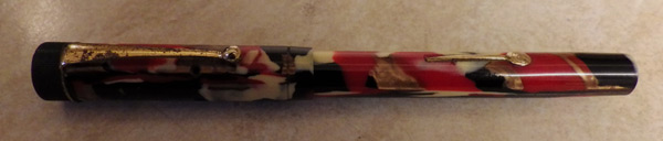 This must be the brightest pen I have ever seen, with the possible exception of the Chilton Clown. The barrel imprint tells me that it is a St Michael pen, made in England. Anything with a St Michael label was made for Marks & Spencer, a leading high street chain store. Marks & Spencer still sell pens today but no longer use the St Michael label. The current offering is a no-name pen which seems to be of moderate quality. I can’t tell with certainty when this pen was made or who made it. As to date, my best guess would be late 30s. The maker could be any one of the major pen manufacturers, or any number of jobbers. It has a Mentmore look but that is probably a red herring.