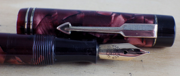 The imprint doesn’t help much in deciding who made the pen. It just says “Savoy British Made Made in England”. A bit emphatic about the location of manufacture, perhaps! This is my second coloured one, and very nice the pattern is too, in a sort of rose marble. I’ve also had a couple of black chased ones, very like 40s Stephens.
