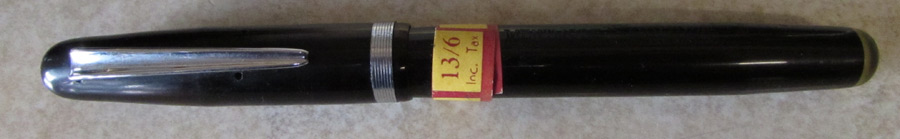 It’s a nice pen and I would have said it was in “New Old Stock” condition had it not been that the clown who sold it to me sent it full of ink which sadly stained the box and papers. The pen has clearly not been used and still retains its sales sticker for the price of 13 shillings and sixpence (including tax).