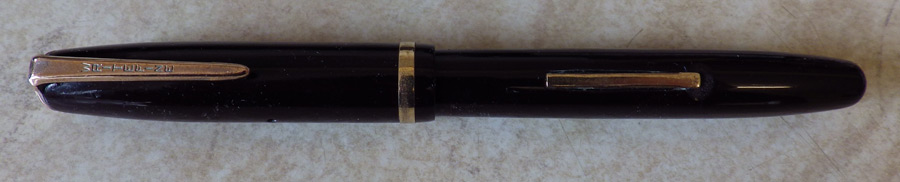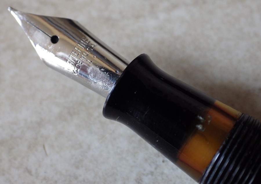 It is sometimes said that Parker only made one pen with a lever fill and that was the Parkette. That’s not quite true. There was another, though it did not bear the Parker name. The Parkette was withdrawn in 1939 and the Writefine was introduced in 1940. This was a very low cost pen at $1, but the quality is surprisingly good. The plastic that it is made of has some heft to it and it feels strong. It reminds me of the material that the Parker 51 is made from. The trim was originally goldplated or perhaps I should say gold washed. A little remains on the cap ring but it is pretty well entirely gone from the clip and the lever. That aside, this pen with its gold coloured metal clip screw, ink-visible section and general air of restrained good quality was a whole lot of pen for the money.