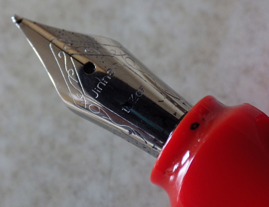 Here’s another of those cheap Chinese pens that are rightly doing so well these days. This is the Jinhao 599A. It comes in various colours but this one is the reddest red thing that you have ever seen. It’s quite a big pen at 14 cm capped and a pretty huge 18.6 cm posted. That’s okay though because it weighs virtually nothing. It’s distinctly reminiscent of the Lamy Safari and I suppose that’s no accident. It also reminds me of the Sheaffer Viewpoint Calligraphy pen. It’s considerably cheaper than either of those.