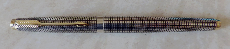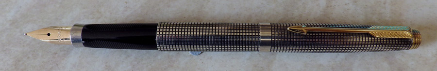 So what makes it such a great pen? For a start, the fact that it’s sterling silver and it has the very fetching chiselled crosshatch pattern with gold plated trim makes it very visually appealing. I find myself constantly turning it over in my hands and enjoying it. Opening the pen shows a wraparound nib, not dissimilar from the Parker 65 nib I wrote about yesterday. The calibrated dial between the section and the nib allows the user to set the pen to his or her own requirements. The tapered section provides a triangular grip which is comfortable for the user, a feature much copied since. It is a cartridge/converter pen and this one has the converter fitted.