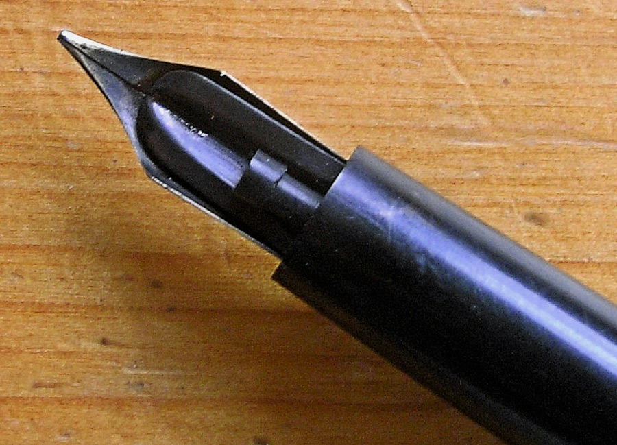 There is nothing discernible on the section, which is rather scratched, though still shiny. The nib is marked BROAD POINT (assuming the central letters hidden by the gold overfeed) and is cut as an italic or stub, is fairly rigid though there is a slight but genuine flex, and writes without pressure with beautiful line variation.