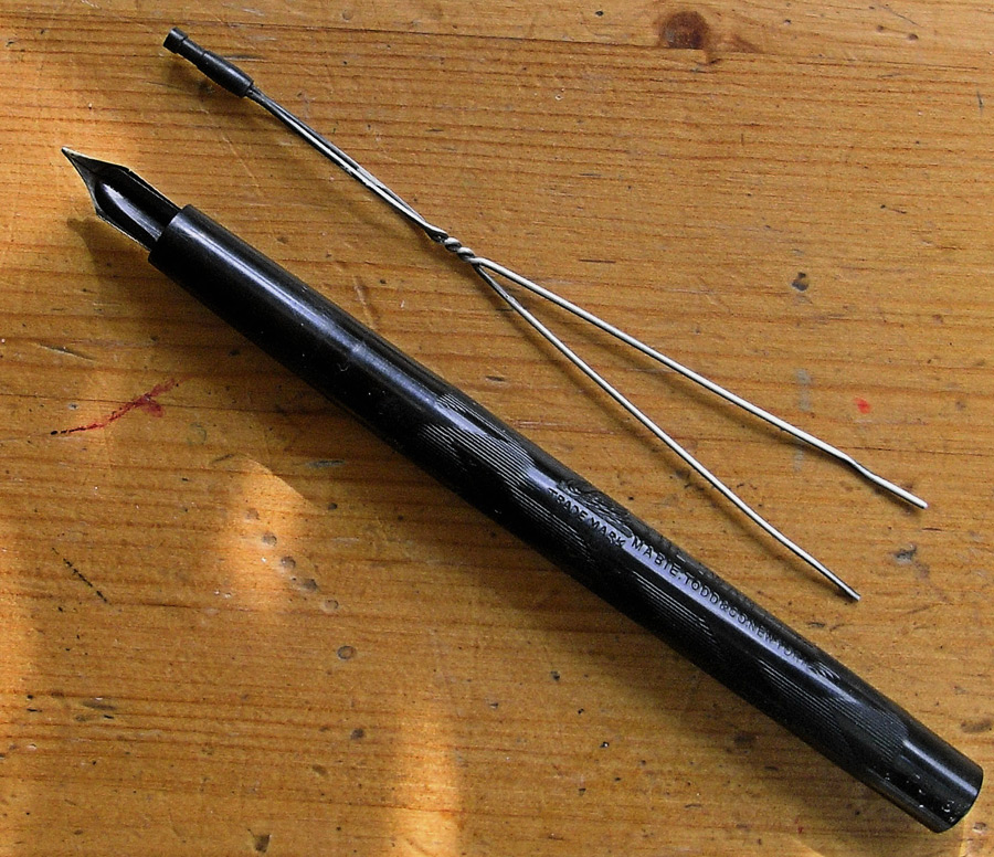 I recently bought a pen similar to this, but apparently somewhat older. It was sold as an eyedropper, and I was bemused to find when I unscrewed the section that long twist of wire, which does not feature on the only other eyedropper I had hitherto had experience of, ‘Nor’s Swan 1500’ which you sold me some time ago. When on seeing this entry I re-examined the new acquisition I found the plug, which I had not noticed before. It is firmly stuck in place, and there is a small nick in the section alongside it which suggests a clumsy attempt to remove it, so I am leaving it there.