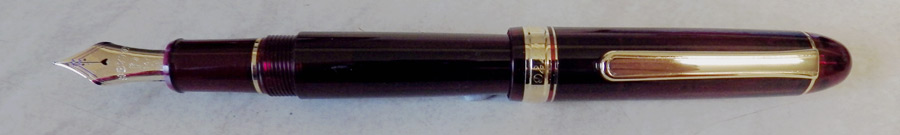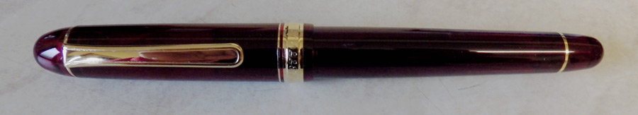 It’s the standard cigar-shaped pen. Where it differs from others is in the plastic (you’re supposed to say resin) which is a deep, rich burgundy and it’s translucent. Very pretty. Much prettier, in fact, than most transparent pens, usually sold as “demonstrators”. It’s a matter of taste I suppose but I find them quite ugly. The innards of this pen are visible if you hold it up to the light but otherwise it’s just a very shiny red pen. The gold plated trim is nice, especially the cap band which bears the legend “Platinum 3776 made in Japan”.