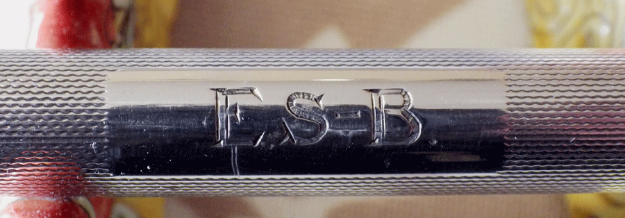 While it’s best to go for branded pens, occasionally one will come across a pen with no maker’s name that is nonetheless clearly high quality. This one is such a pen. It’s a 1920s pen with no clip. It has a sterling silver barrel overlay and the cartouche contains the initials E S-B, so its original owner had a double-barrelled name. Sadly, the hallmark is cut in half by a seam, otherwise I would have been able to get the date.