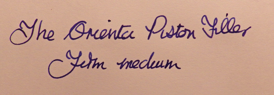 The pen is quite chunky and old-fashioned-looking and measures 12.4cm capped. The barrel looks a little uneven as if there has been some shrinkage going on there but the piston slides up and down smoothly and there is no leakage. The fading gold imprint on the cap reads ‘Orienta’, a strange enough name for a pen but many pens have strange names. The pen holds a good charge of ink and the nib is a firm medium. It’s not quite my cup of tea; I prefer a fine but that’s nothing against the pen, just my preference. The ink delivery is generous but not over-generous. In all, it’s an excellent writer.