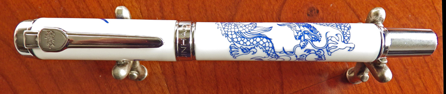 I love blue and white porcelain, and I’m quite attracted to Chinese dragons, too. Some years ago, this ridiculously cheap pen that fulfilled both of those requirements caught my eye. I paid whatever the paltry sum was, waited a few weeks for it to travel from China by mule-train and it eventually arrived. I wasn’t disappointed. Viewed purely as a porcelain blue and white object, like my dinner service or the little ornaments I have, it was beautiful. Not a work of fine art, you understand, but an eye-catching little item, worth every penny of the £1.50 or whatever it was I’d paid for it.