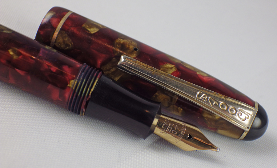 This, rather obviously, is the Burnham version. It has the typical Burnham pressed steel clip with a slight coating of gold plate, now mostly gone. The plating has survived a bit better on the plain, straight, unadorned lever. Like most Burnhams of this period it’s a casein pen, in a glorious red, gold and black marbled pattern. The top of the cap is finished with a domed black clip screw. “Chatsworth” is stamped on the barrel.