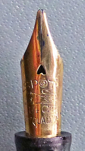 I’ve written about the Spot pen before and outlined its history. Mentmore tend to be rather dull, worthy pens with unyielding nibs but the Spot brand seemed to allow the company the freedom to make an altogether more interesting pen. There were true ripple pattern pens, something no one apart from Waterman made. The one I wrote about before was a thirties pen in the style of the Balance.