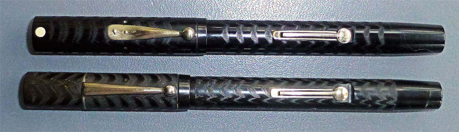 This is an earlier pen, perhaps the first half of the twenties by its appearance. The black chased hard rubber remains black, quite unfaded, and the engine turned pattern is sharp enough to cut you. The tolerances are tight and everything fits together just as it should. It’s a beautifully-made pen and it wears its years very well.