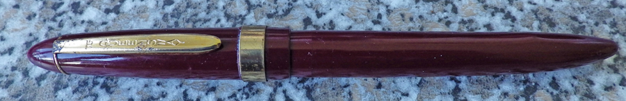 The section is black, tapered and bearing a very decided “stop”. It has a traditional style of nib that wraps around the sides of the feed. It’s a plated nib of course. When I was Googling for information on the brand I came upon another example of this model on Etsy. The seller said it had an 18 carat nib. 18 carat gold-washed! This pen actually writes well and doesn’t spew ink, which may be why it has lived so long. There are signs of plastic shrinkage as you would expect but it isn’t too bad. It’s an adequate pen but you wouldn’t flash it around and boast about it.