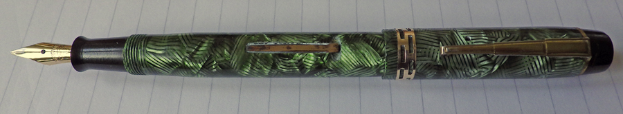 I would guess that it is a product of the early nineteen fifties. It is a handsome pen in very good condition. The gold plating has held up well except on the lever where there is some loss. The clip is stepped in the Art Deco style and the cap band is moderately broad and pierced. The pattern of the celluloid is marbled dark and light green with an overlay of randomly aligned striations. I have seen this very attractive pattern on Uniques before. Those pens were made from wrapped celluloid sheet. I can see no seam here and I assume it was machined from the rod. The tassie is made from some form of plastic, hard rubber having been finally laid aside for that purpose. I’m not sure about the material of the section. The feed may well be ebonite.