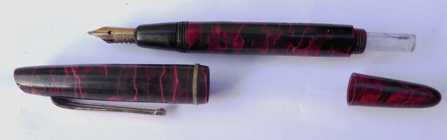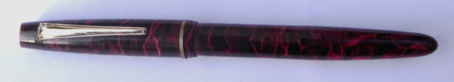 Occasionally the clouds part and a brief glimmer of light gives us a view of Unique’s situation. This rather attractive red and black marbled pen was made in France. Perhaps it was cheaper to have the pens manufactured there than in the UK. It’s a well-made pen, machined from the rod rather than wrapped celluloid or the injection moulded plastic which was becoming ever more common at that time. At 12 cm capped it’s quite a small pen. It has a warranted English nib and the barrel is imprinted “Unique” and “Made in France.”