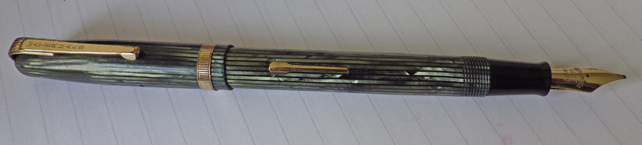 This series retains the Art Deco clip of its predecessors but the box lever has been retired to be replaced by a simpler spatulate lever. I’m not quite sure how to describe this green and black pattern: not so much striated as striped perhaps. The cap band is vertically incised.