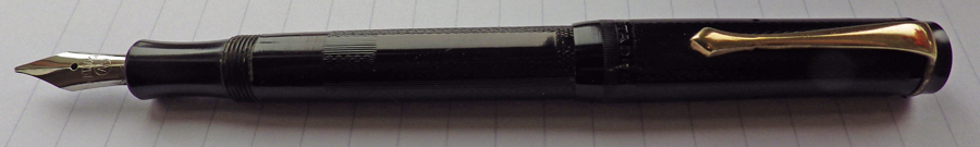 Like many other piston fillers of the time, this Matador has a blind cap which, when removed, reveals a milled turn-button to activate the piston. Though I’m sure that not everyone will agree with me, I find one piston-filler pretty much like another. They are are usually quite straightforward to strip down and renovate. There are exceptions like the Big Ben which seems impossible to repair. Piston fillers, it seems to me, are the best of the “ink in barrel” pens, less liable than eyedropper fillers or bulb fillers to discharge their contents over your work. This Matador remains just as practical a day-to-day user as the latest Pelikan and it has the advantage of a much superior nib.