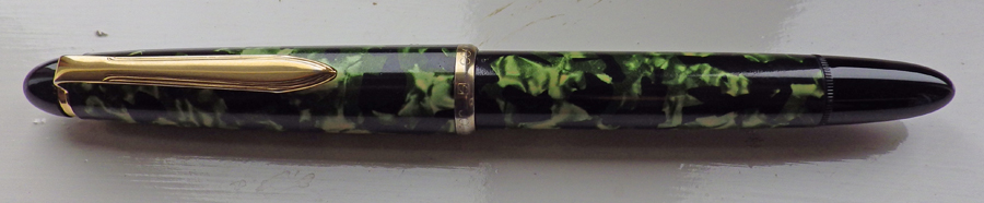 This is a Senator Windsor, a handsomely patterned German piston filler, dating to about 1955. I’m not quite sure how the pattern is achieved. It looks like the celluloid of years before but I don’t think that is what it is. The gold plating on the Pelikan-like clip has proved durable but there is some wear on the cap lip ring. It is finished in shiny black plastic at the barrel end and cap. It has a blue clear area and the medium nib is iridium point Germany. The piston is directly activated by the blind cap.