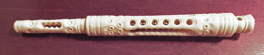 Regardless of the material or the date of manufacture, this is a very attractive pen. The Stanhope of the Crystal Palace is clear and the carving (or moulding) is detailed and the pattern is consistent. The condition of the metal part, somewhat darkened and discoloured, suggests age. I don’t see any marks of a mould but they may have been removed by final work. As well as its considerable aesthetic attraction, it makes a practical dip pen, and because the nib can be reversed and screwed into the body of the instrument it is portable.